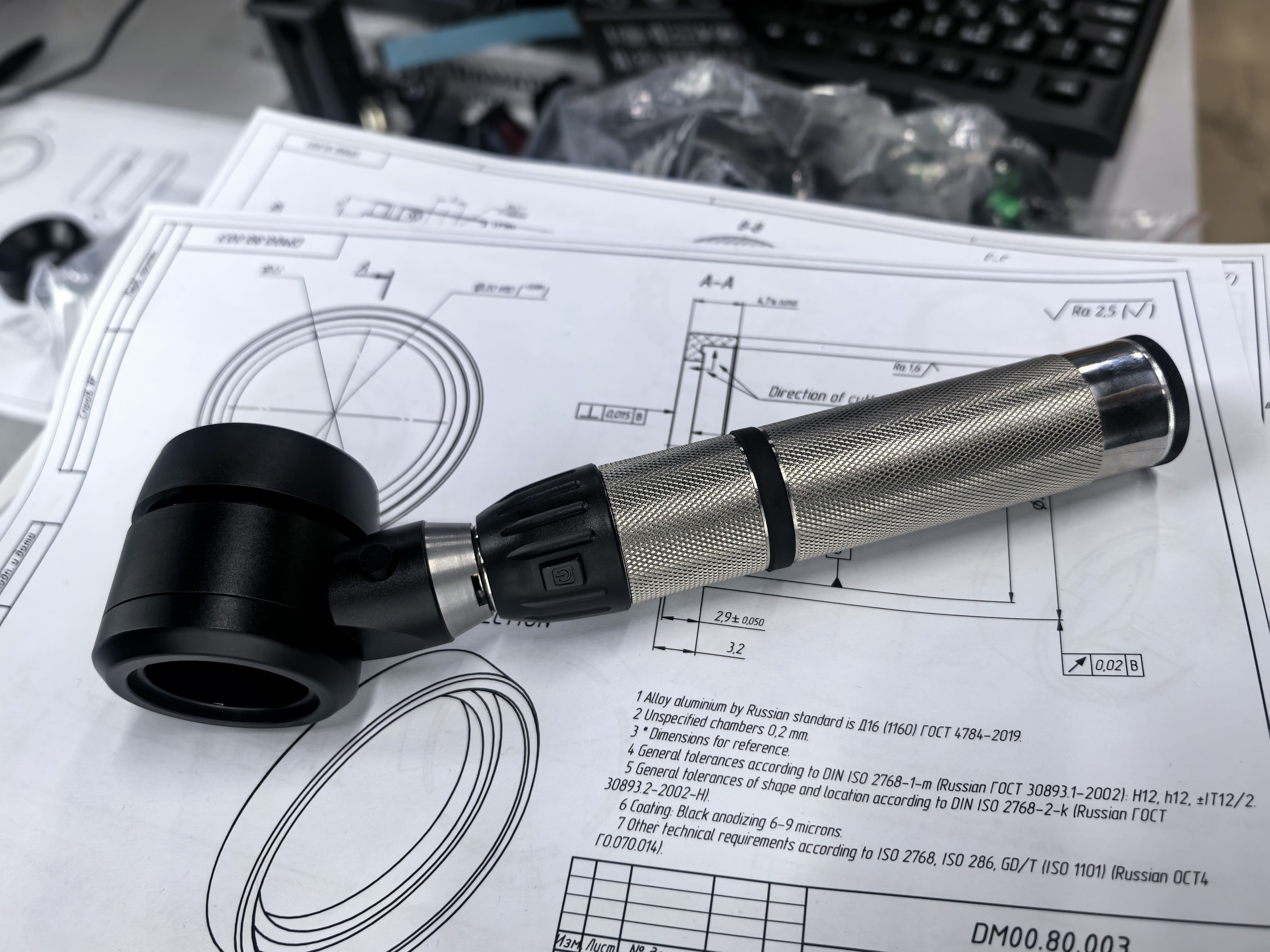 Каждая деталь Stern Derma прорабатывалась в SolidWorks и согласовывалась с оптическим заводом ЛЗОС. Допуски - микронные: шероховатость Ra 2,5, отклонения в сотых долях миллиметра. Материал корпуса - алюминиевый сплав Д16 с чёрным анодированием 6-9 мкм.